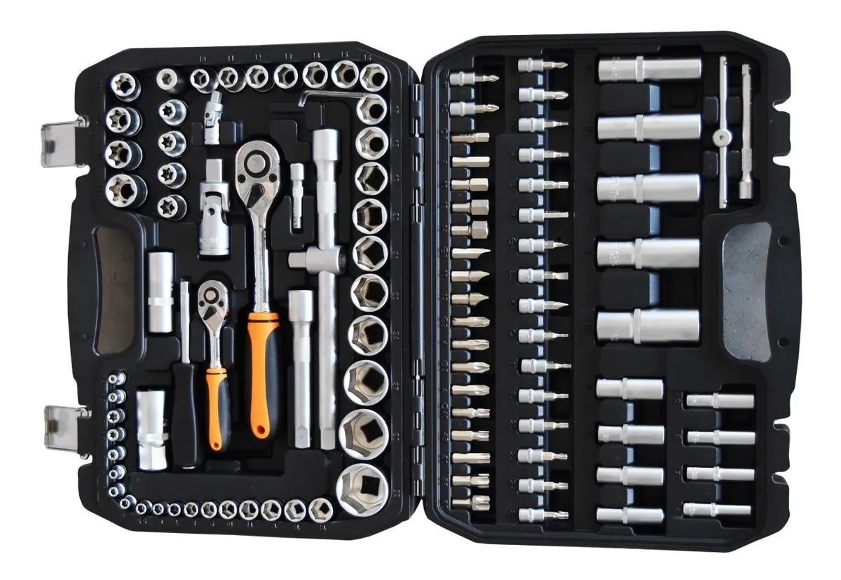 Set profesional de mecánica integral diseñado para ofrecer una solución completa en el taller o el hogar. Fabricado en acero Cromo Vanadio (Cr-V), este kit incluye una amplia variedad de llaves crique, bocallaves y puntas de atornillar con encastres de 1/2″ y 1/4″, permitiendo abordar desde tareas de precisión hasta trabajos de alto torque.