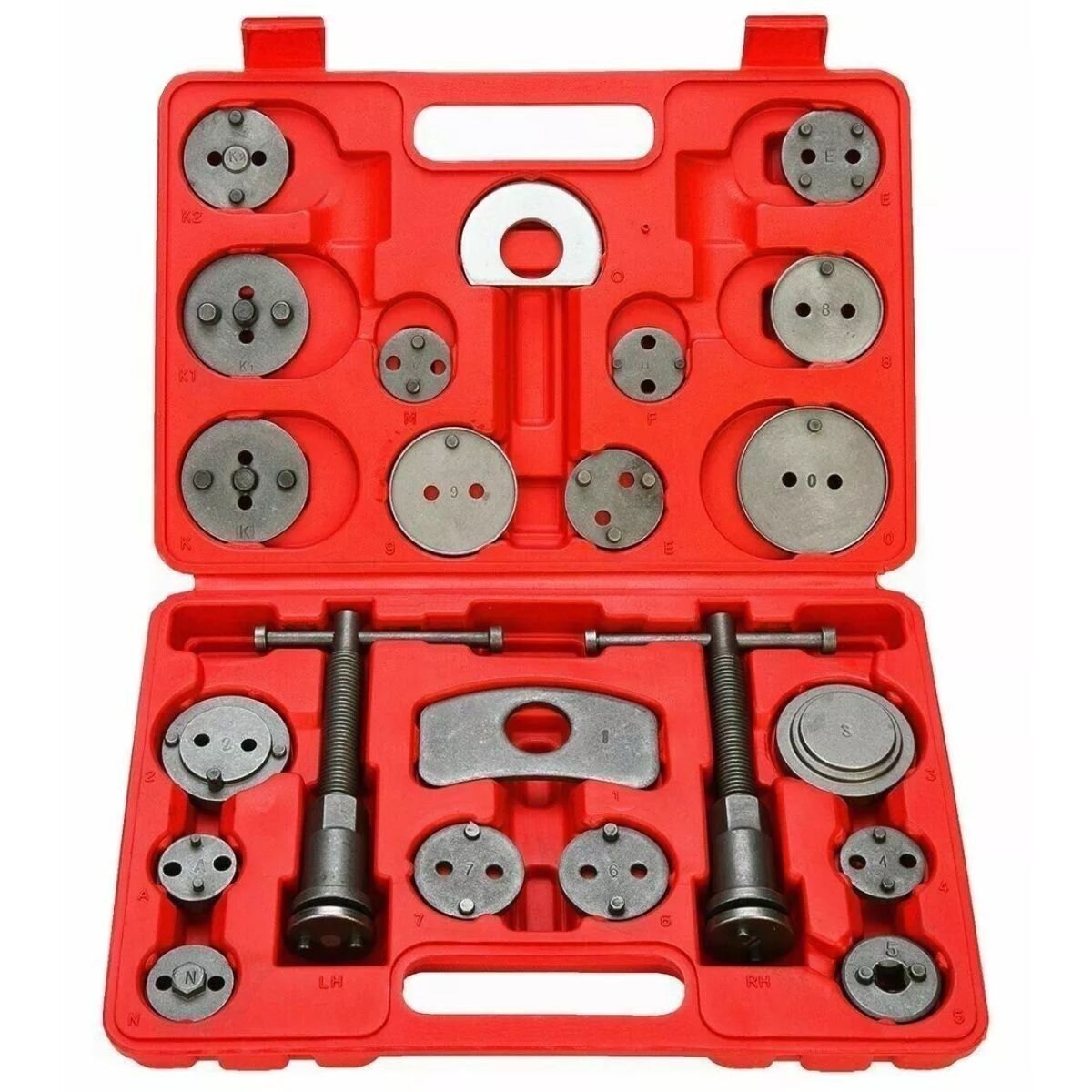 Set profesional de 22 piezas diseñado para retraer los pistones de freno de forma rápida y segura durante el cambio de pastillas. Este kit es indispensable para vehículos que cuentan con el mecanismo de freno de mano integrado en el caliper, ya que permite presionar y girar el pistón simultáneamente sin dañar los sellos ni el sistema de rosca interna.