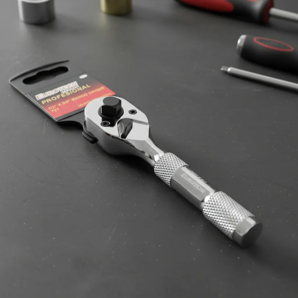 Herramienta profesional de diseño compacto (tipo Stubby) diseñada específicamente para trabajar en espacios extremadamente reducidos donde una llave crique convencional no tiene rango de giro. Fabricada en acero Cromo Vanadio (Cr-V), combina una estructura robusta con un mecanismo de alta precisión para ofrecer el máximo rendimiento en lugares de difícil acceso como motores modernos o maquinaria industrial.