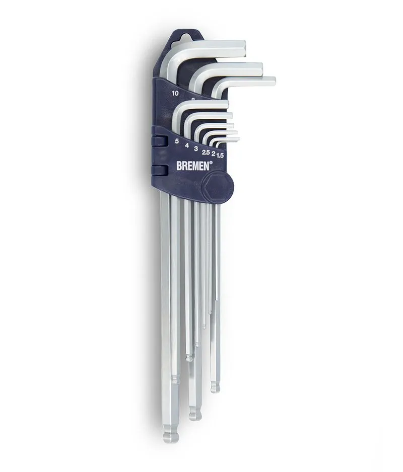 El juego de llaves Bremen 3971 es un set de herramientas profesionales diseñado para el ajuste y desajuste de tornillos hexagonales en medidas imperiales (pulgadas). Fabricadas en acero Cromo Vanadio (Cr-V) de alta calidad, estas llaves cuentan con un diseño largo con punta cardánica (bola), lo que permite trabajar en ángulos de hasta 25°, facilitando el acceso a tornillos en lugares confinados o de difícil alcance.